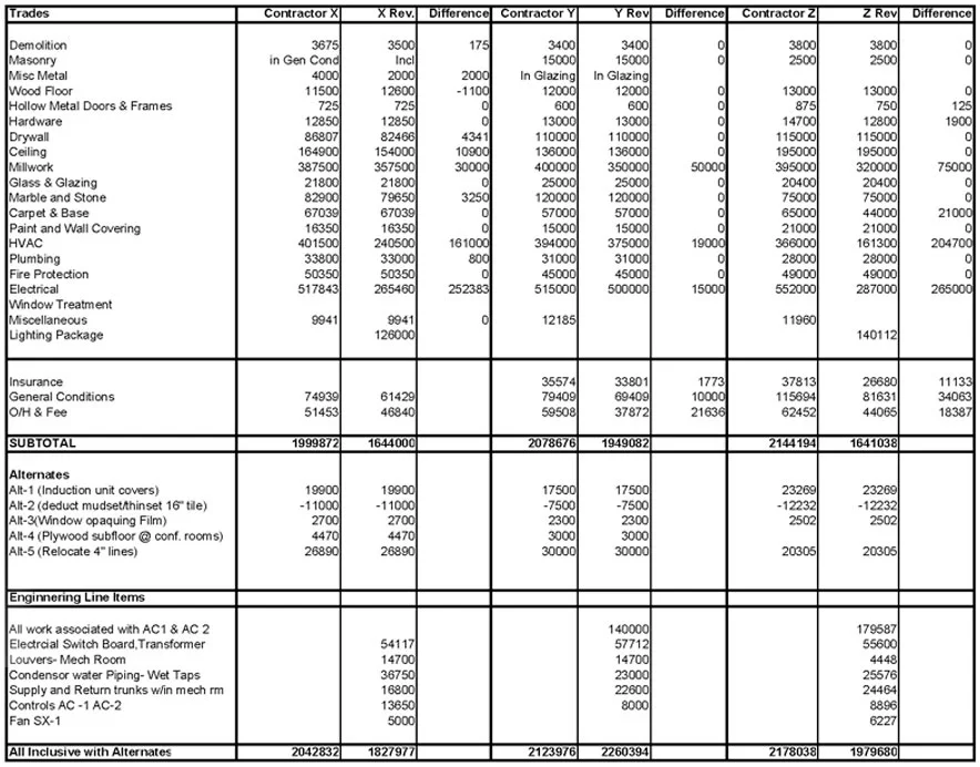 The information obtained during this phase of the project is then analyzed and compared relative to the lease and the work letter tendered by the landlord. The end goal is to provide the tenant with the appropriate information to negotiate a lease which addresses deficiencies in the prospective tenant space during lease negotiation.